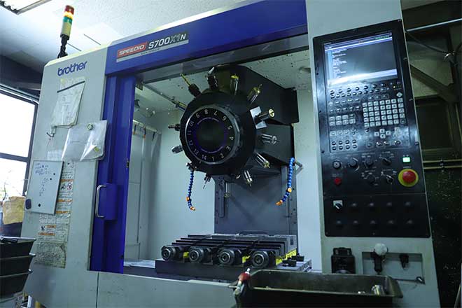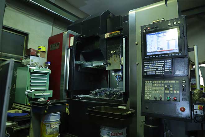 40番タイプの機械に主軸を50番タイプにした剛性も兼ね備えたマシニングセンターです。 小回りもきくため量産物の加工にも適しています。 円テーブルも搭載しており、角度をふっての穴あけ加工なども可能となっております。