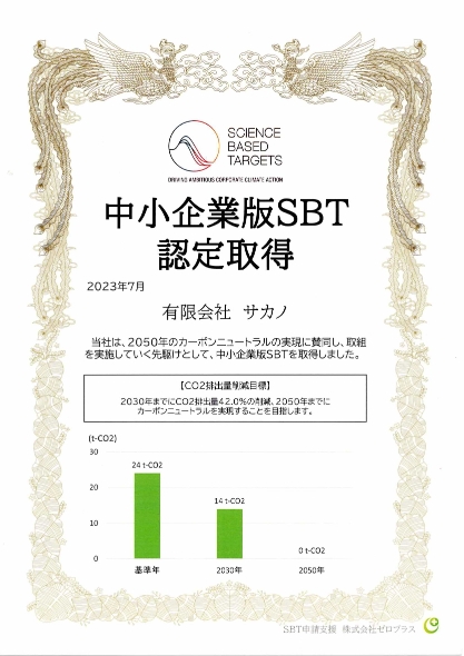 有限会社サカノは、脱炭素の国際認証である中小企業版SBT(Science Based Targets)の認定を取得しました。